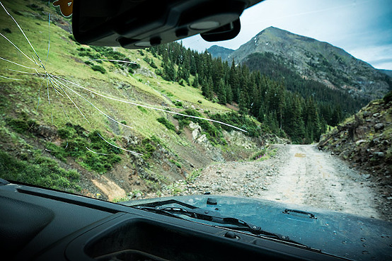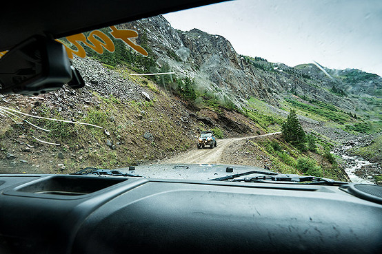 After about 20 minutes of driving, we turned left onto the road leading to Animas Forks ghost town which paralleled the river in the gorge. It began to rain. As the road narrowed and climbed, deep ruts appeared. When I saw the large sign: “4X4 TRAIL BEYOND THIS POINT. HIGH GROUND CLEARANCE REQUIRED,” I knew we’d better turn around. There were holes with standing water (who knew how deep?), curving unprotected cliff edges, and oncoming ATV’s that were buzzing straight toward us in lightning speed. Ah, no! Not in a car rental. So we turned around. Back in town, I did a google search for Jeep tours. (I was surprised by the lack of tourist brochures in town for any kind of organized tour. Even at the Visitor Center.)