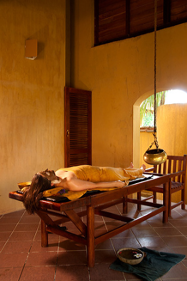 Each guest room has an attached pavilion where the massages and most treatments are done. You simply slip into the provided robe and wait for the masseuse to come to you in the privacy of your own garden! But first an Ayurvedic doctor arrives, reviews your medical history, performs a little exam, then prescribes the type of oil to be used and recommends specific treatments. If you’re perfectly healthy, you just select 3 treatments that interest you. Like a full body massage that includes foot reflexology and long strokes across your abdomen…