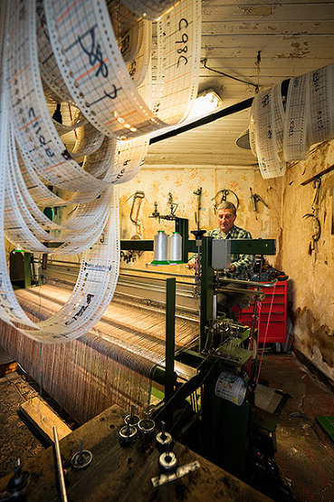 Weavers set up the loom according to the pattern card which detail the weft and warp threads needed to create the desired Harris Tweed. Ad after hand tying the yarns to the loom, they get to pedaling! Looms are human-powered, by foot.