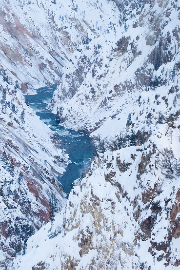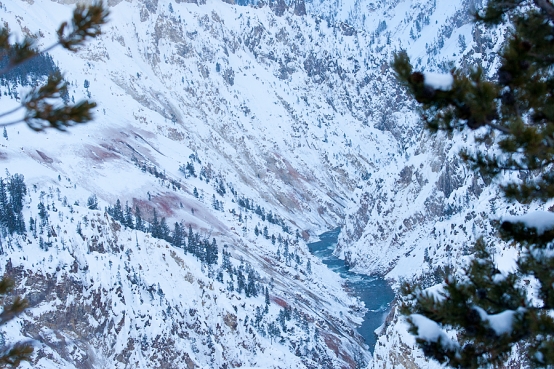 While I like to include diffused objects out of focus in the foreground of portraits, wildlife, or still lifes to create depth and a strong selective focus, I generally do not like to do so in landscapes. At least not in a scene such as this. I find these trees too distracting, as my eyes keep going over to the edge rather than the center subject, the river. Yes, I could’ve used a greater depth of field and kept everything sharp, from the trees to the river. But, what is the subject? The river. And the focal point? For me, it’s the contrast of the steep snowy banks with pointed pines and reddish-pink mineralized earth that descend to the 24 mile river below.