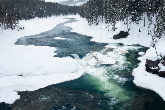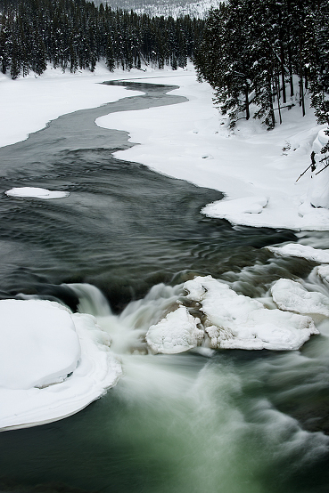 There are over 250 waterfalls and countless scenic river overviews in the vast 2.22 million acre Yellowstone National Park. So if you’re naturally drawn to waterscapes, there are plenty to photograph! I’ll admit that I’m not one that usually seeks out either…especially in Yellowstone, where I’d rather be photographing frosty bison, stark lodge pine trees or vivid mineral springs that are randomly unveiled in misty steam. Time completely disappears when I wander around those geyser basins. Each bend brings new surprises, and my camera goes into overdrive trying to capture the surreal surroundings. Pretty waterfalls or rivers, for me, lack the same appeal. I have to work harder to “find” the best composition. So where do I start?