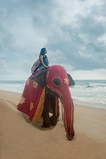 High humidity, fogged camera lenses, high winds that made using an umbrella (light modifier) impossible, high tide, high waves, an ansy elephant afraid of the waves, an anxious model afraid of the elephant, limited natural light, and eventually rain…made for a challenging day!! And reduced our shooting time to just an hour and fifteen minutes.