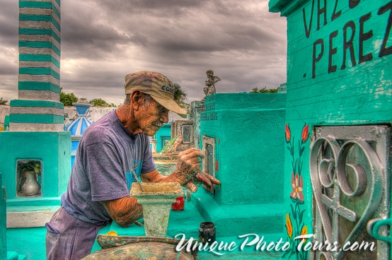 I like HDR images of people… The man below was readying the cemetary for Santa Semana celebrations. The only part that was moving was his hand. As you probably realize, movement is the bane of HDR photography.